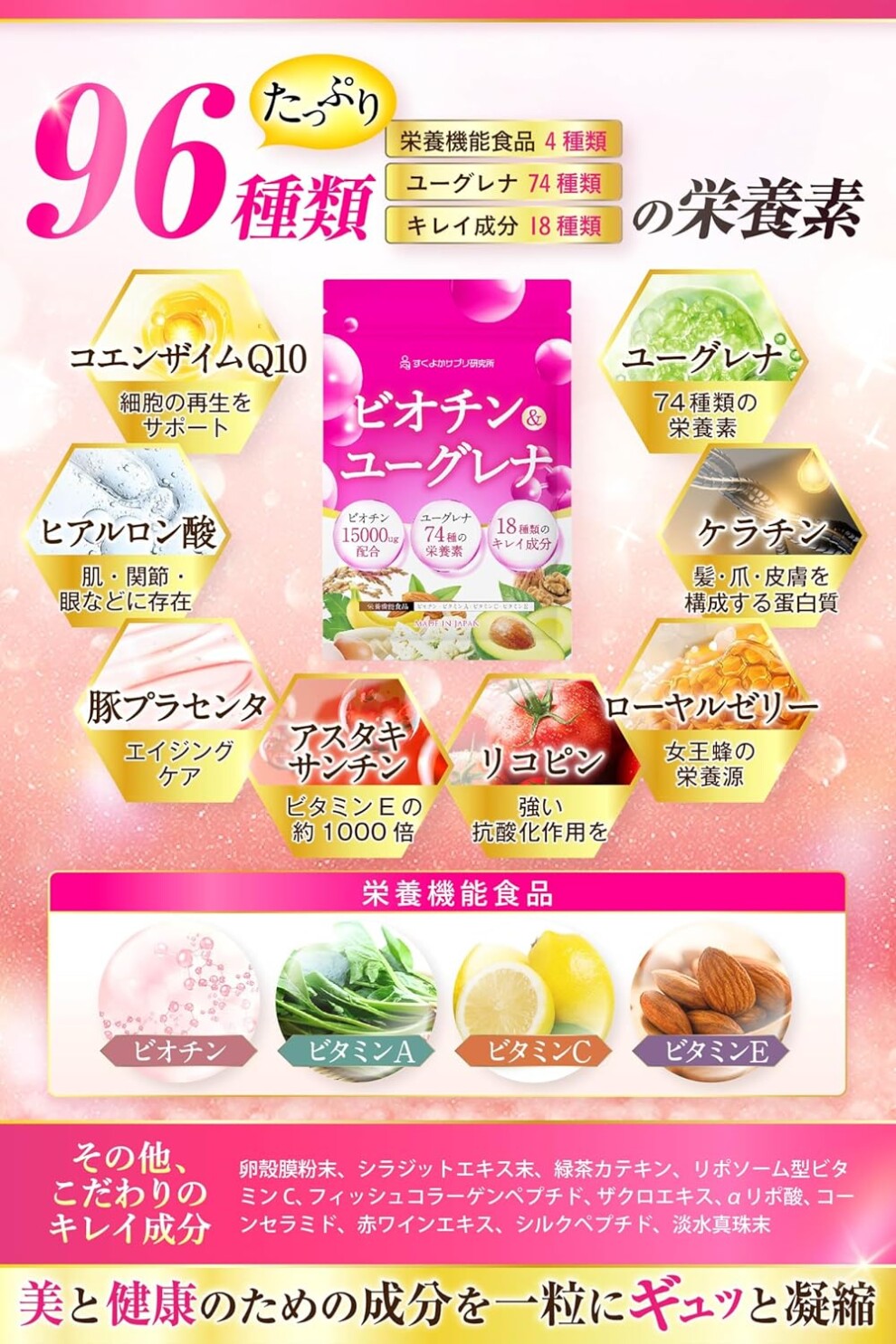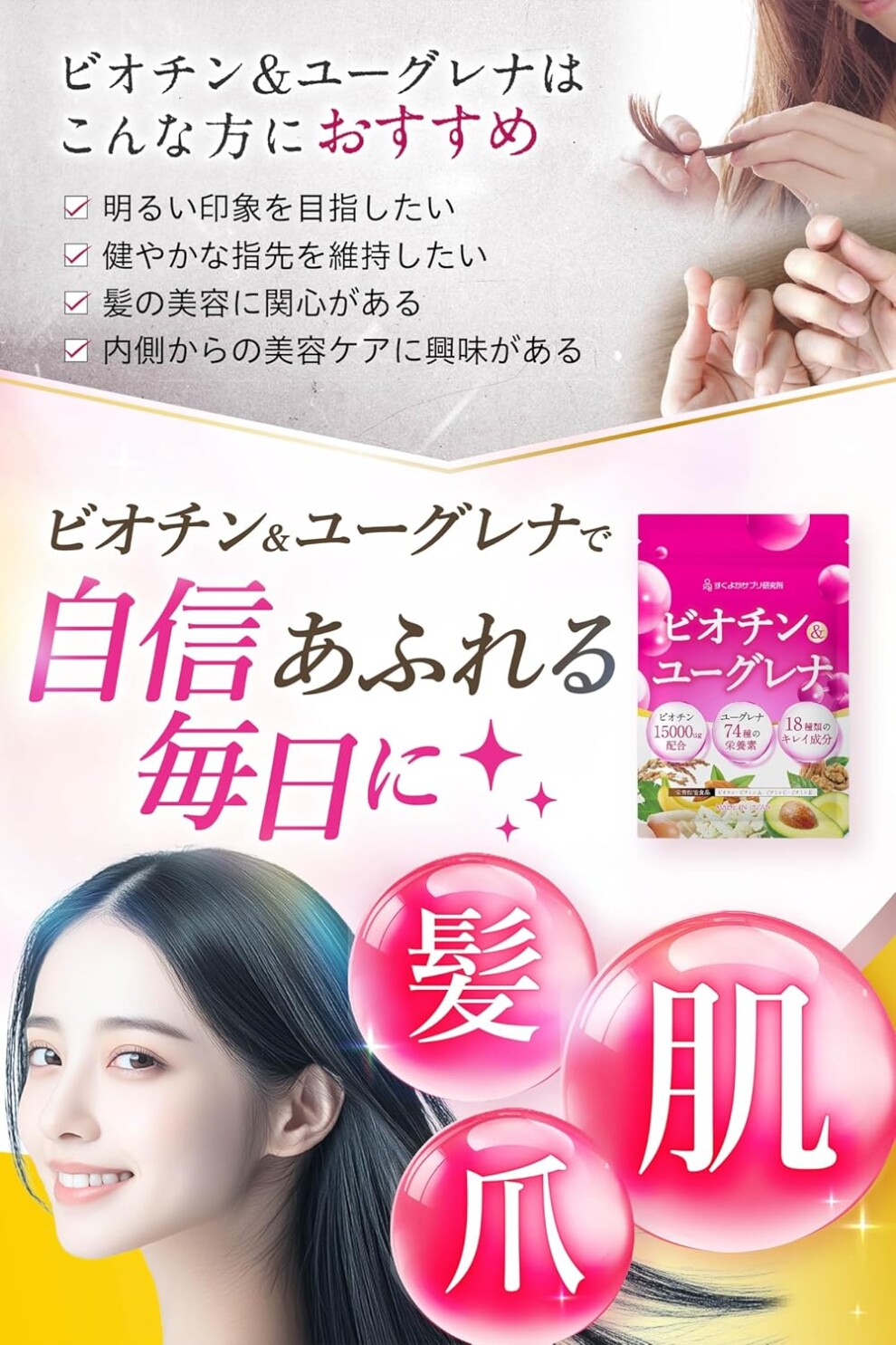 «Биотин и Эуглена» — это добавка, разработанная под руководством доктора Тэ Ито, директора Токийского института мозгового дока и директора нейрохирургии в здании парка Акасака, клиники Сугавара. Он содержит биотин на самом высоком уровне. Содержит высокую концентрацию биотина,экстракт эвглены +96 питательных веществ +18 компонентов для красоты. Биотин — это тип группы витаминов B, необходимый для поддержания здоровья кожи и слизистых, способствующего обмену веществ и функции клеток. Поскольку в организме вырабатывается лишь небольшое количество, важно получать его из ежедневного приёма пищи и т.д., но использование добавок — лучший способ эффективно получить достаточное количество добавок с помощью «Биотина и Эвглены», Вы можете одновременно принимать биотин высокой концентрации (15000 мкг в день), а также множество других питательных и бьюти-ингредиентов. Рекомендуется тем, кто ищет красоту изнутри.
