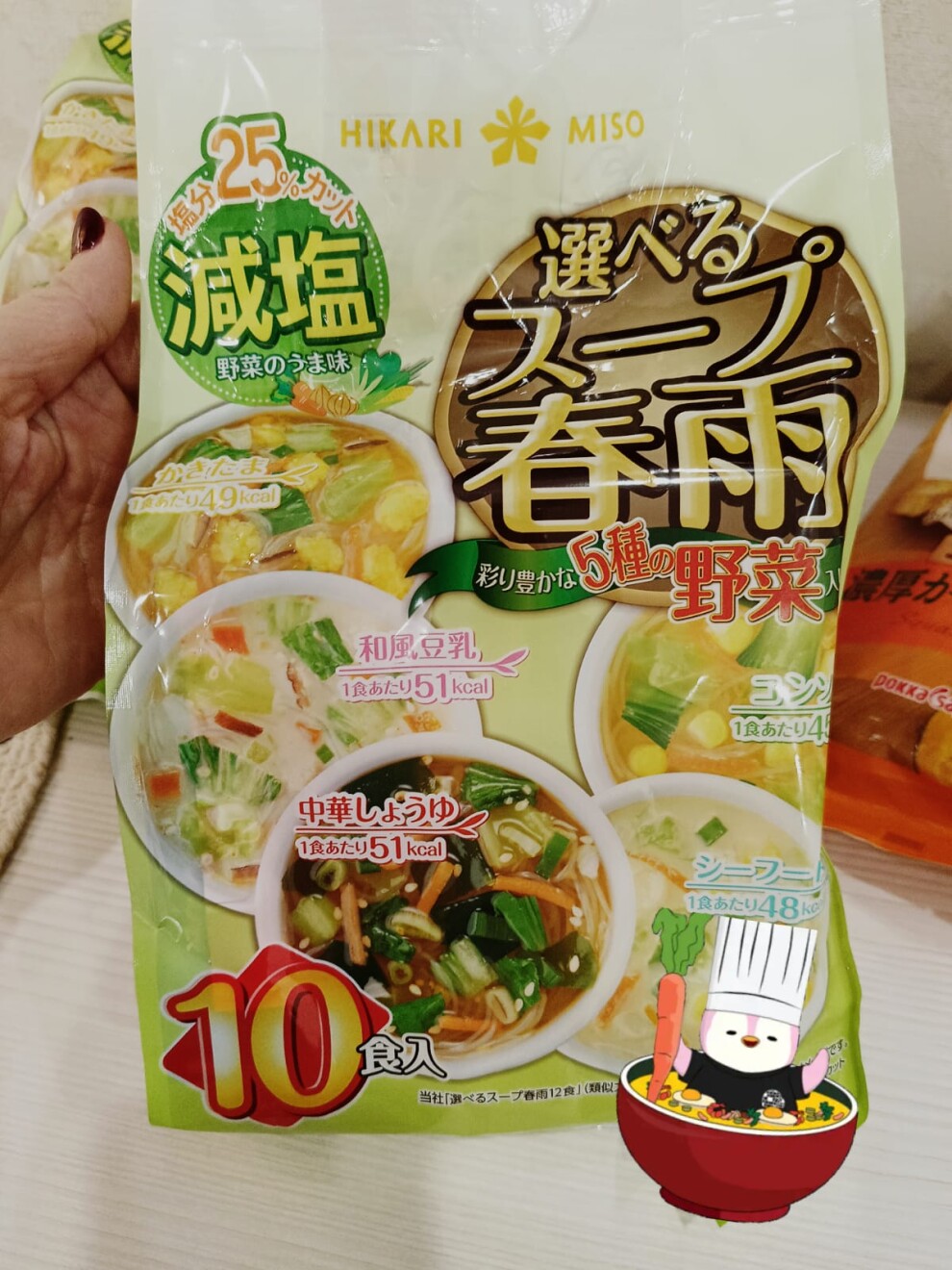 1-В упаковке 10 порций (5 вкусов супов по 2 пакетика). В дополнение к бульону в упаковке есть стеклянная бобовая лапша фунчоза.Способ приготовления: положить в небольшую чашу фунчозу и выбрать основу для супа из пяти предложенных. Залить фунчозу бульоном из пакетика и кипятком. Оставить на 5 минут для заваривания фунчозы. Воды рекомендуется от 250 мл до 500 мл. Проверяйте соленость супа для нахождения правильной пропорции воды под вашу емкость.Удобно взять с собой на работу или приготовить дома.Состав: соль, сахар, вакаме, лактоза, порошкообразный соевый соус, сушеный лук, декстрин, семена кунжута, куриный экстракт, дрожжевой экстракт, порошкообразная бонито, протеиновый гидролизат, экстракт кацуо, экстракт гребешка, экстракт шиитаке, перец, имбирь, кунжутное масло / загуститель (обработанный крахмал, ксантан), приправы, карамельный краситель, подкислитель.